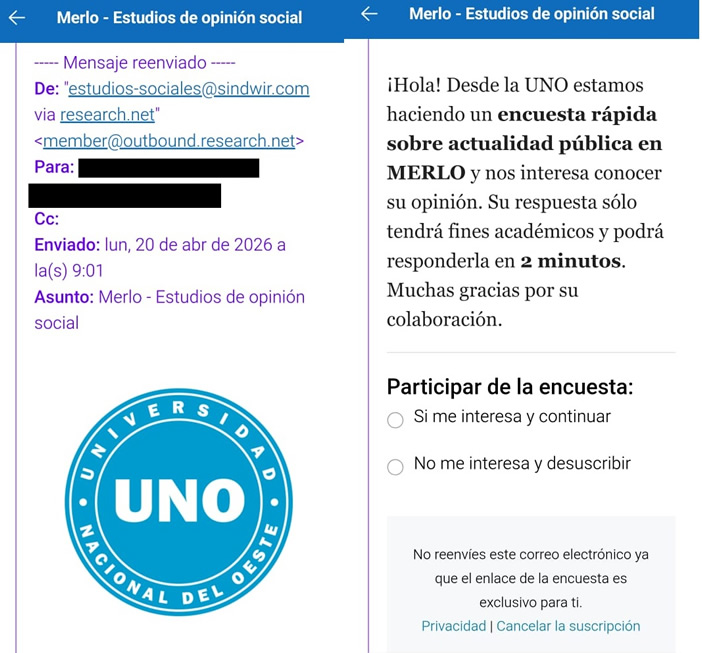 Los vecinos de Merlo se sorprendieron al ver en sus casillas de Mail, una encuesta local que llegaba desde la dirección de la Universidad Nacional del Oeste que hoy maneja como quiere el intendente Menéndez a través de su amigo y rector, “el lagarto” Soos. Nadie podía entender cómo a pesar de que nunca habían cursado en la Universidad, Menéndez tenía sus direcciones de Mail. “¿Será un virus? ¿Es una encuesta genuina? ¿Por qué razón quiere que le brindemos estos datos?”, eran los interrogantes principales del los vecinos cada vez más desconfiados con las oscuras y malintencionadas maniobras de Menéndez. Parece que del lado de Menéndez hay preocupación por los bajísimos números de aceptación de su gestión y el enorme rechazo popular que hoy produce el intendente de Merlo en los habitantes de su pueblo. Menéndez en lugar de utilizar la UNO como unidad básica debería preocuparse por levantar el pobrísimo nivel educativo que hoy tiene la casa de estudios que en sus principios, era un ejemplo entre las universidades de la zona.