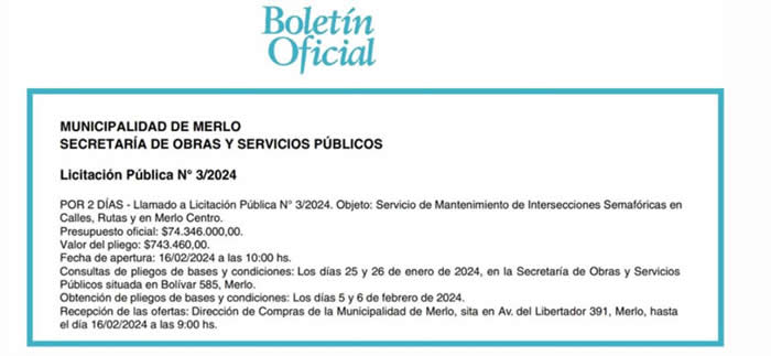 Lo más grave es que el intendente había licitado el arreglo de los semáforos de Merlo a un costo de $ 74.346.000 millones de pesos pero ninguno funciona correctamente. ¿A dónde fueron esos millones de pesos si los semáforos andan todos mal? ¿O los hacen andar mal a propósito para engañar a la gente y recaudar para unos pocos?.