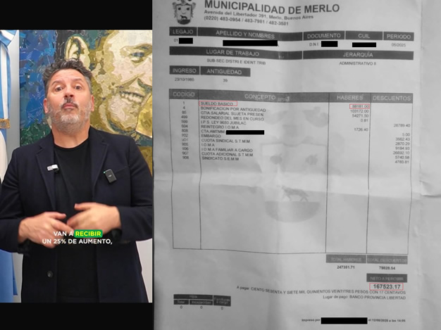 Una más de las gravísimas mentiras que dijo Menéndez en el año 2015 para llegar a la intendencia de Merlo queda en evidencia a pocos días de una nueva elección. El trabajador municipal de Merlo tiene la particularidad de tener hoy el sueldo básico más bajo de la Provincia de Buenos Aires con apenas 88 mil pesos. En una maniobra desesperada para intentar que los trabajadores municipales lo voten, el intendente Menéndez adelantó el aumento de sueldo que tenía programado para el mes de octubre, para que lo cobren días antes de las elecciones. El aumento es una tomada de pelo al pobre empleado municipal de apenas un 25% del sueldo básico. Acá vemos un recibo de un empleado administrativo categoría 2 o sea, casi jefe de sector con solo 88 mil pesos de sueldo básico. Con el aumento de Menéndez, se le sumará ahora un poco más de 20 mil pesos por mes. En este caso, el trabajador cobra más por antigüedad que por el básico, logrando un sueldo total de apenas 167 mil pesos por mes, siendo menor al de un jubilado y muy por debajo de la línea de indigencia. Pero Menéndez es tan bueno que se lo adelanta justo antes de las elecciones. ¿En serio el intendente Menéndez piensa que dándoles un poquito más de 20 mil pesos a los trabajadores municipales, ahora lo van a votar? No solo los denigra con el sueldo mensual, sino que también los deshonra con un miserable aumento. El desprecio de Menéndez es total, no solo para el pueblo de Merlo, sino también para sus propios empleados municipales.
