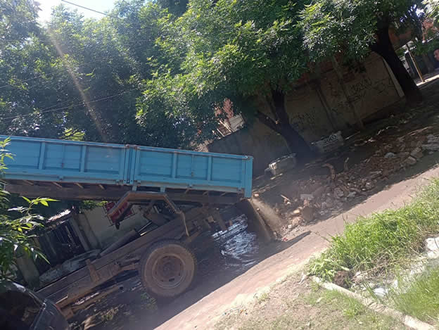OCTUBRE/25 UN CAMIÓN DE RECOLECCIÓN DE BASURA SE QUEDÓ ATASCADO EN UNA CALLE CON LOS LADRILLOS QUE MENÉNDEZ HACE PASAR COMO “NUEVOS ASFALTOS”